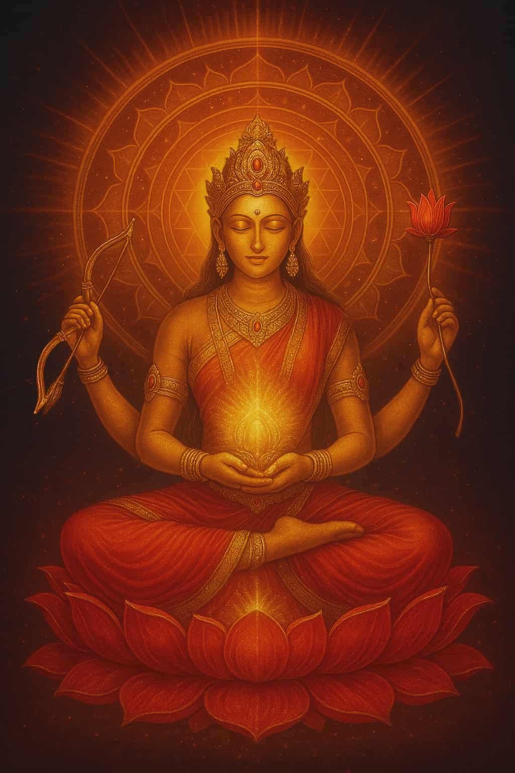Bhagwati Yogmaya is the principal presiding deity of Purnabhishek Sadhana. She is visualized as seated upon a lotus flower throne, adorned in red garments and a royal crown. In her hands, she holds a lotus flower and a sword, symbolizing purity and divine power. To her left stands Goddess Mahalakshmi, and to her right, Goddess Mahasaraswat
